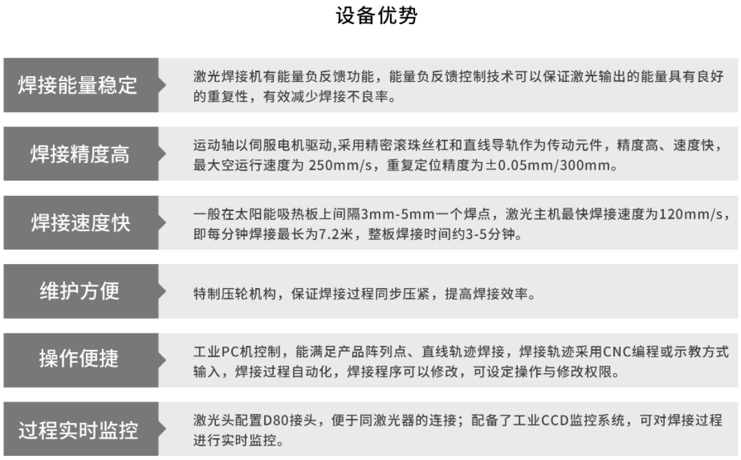 该设备主体机架采用优质钢焊接而成,外观喷涂电脑灰色,采用优质Q235A钢板做封板,台面平面度达±0.06mm,整体采用双工位、双出射头四维工作台,出射头可自动旋转,适用于太阳能集热板横向、纵向焊接,其中X、Y轴为伺服驱动,采用高精密级滚珠丝杆及滚珠导轨传动,各轴行程为X轴3000mm、Y轴1200mm、定位重复精度达±0.05mm/300mm;激光头部分可自动旋转(可焊接横管和直管);各铜管间隔距离可根据实际要求可左右调节,激光头部分装有滚轮(焊接时行驶在铜管上端),以确保在焊接时铜管与铝板能完全粘紧,压轮可适用φ12、φ10及φ8三种规格;工业PC机控制,能满产品阵列点、直线轨迹焊接,焊接轨迹采用CNC编程或示教方式输入,焊接过程自动化,焊接程序可以修改,可设定操作与修改权限;激光头可升降调节焦距,标配17寸显示器。